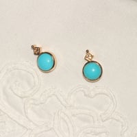A vibrant round turquoise cabochon shines brightly, accented by a delicate Deco-inspired square frame adorned with sparkling champagne diamonds. This earring blends vintage charm with modern sophistication, adding a radiant pop of color to any look.