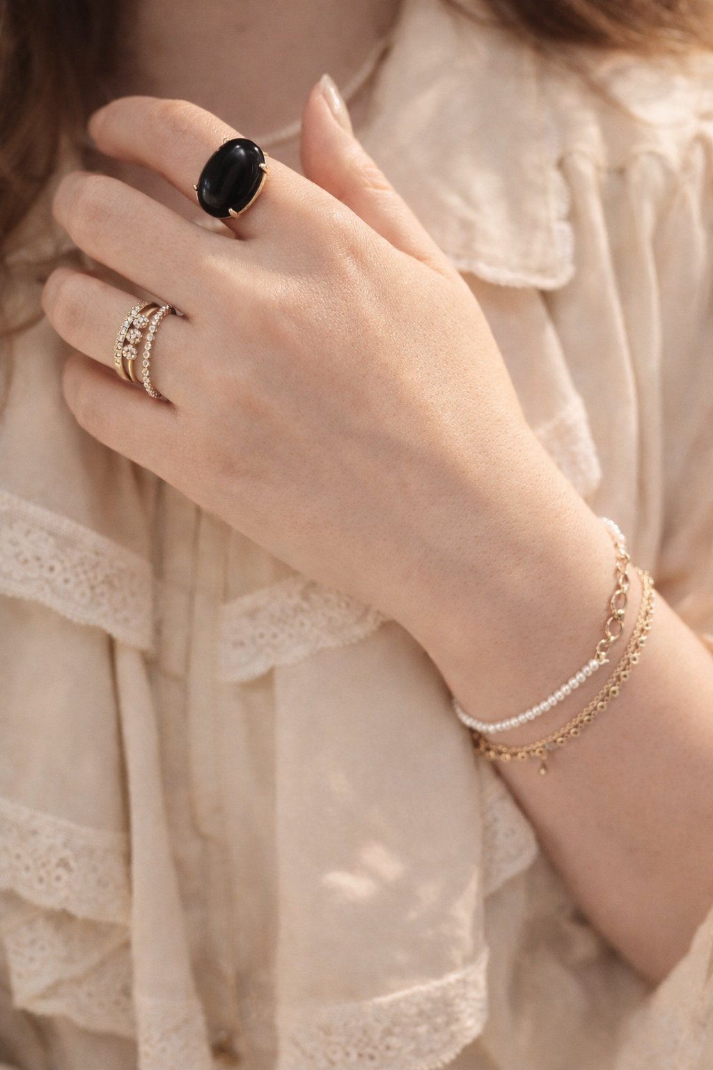 A quiet statement in 14K yellow gold — featuring an 18x13mm natural black onyx cabochon that evokes the mystery of an eclipse. Bold yet wearable, its smooth, mirror-like surface captures the calm strength of the night sky, balancing elegance with effortless sophistication.