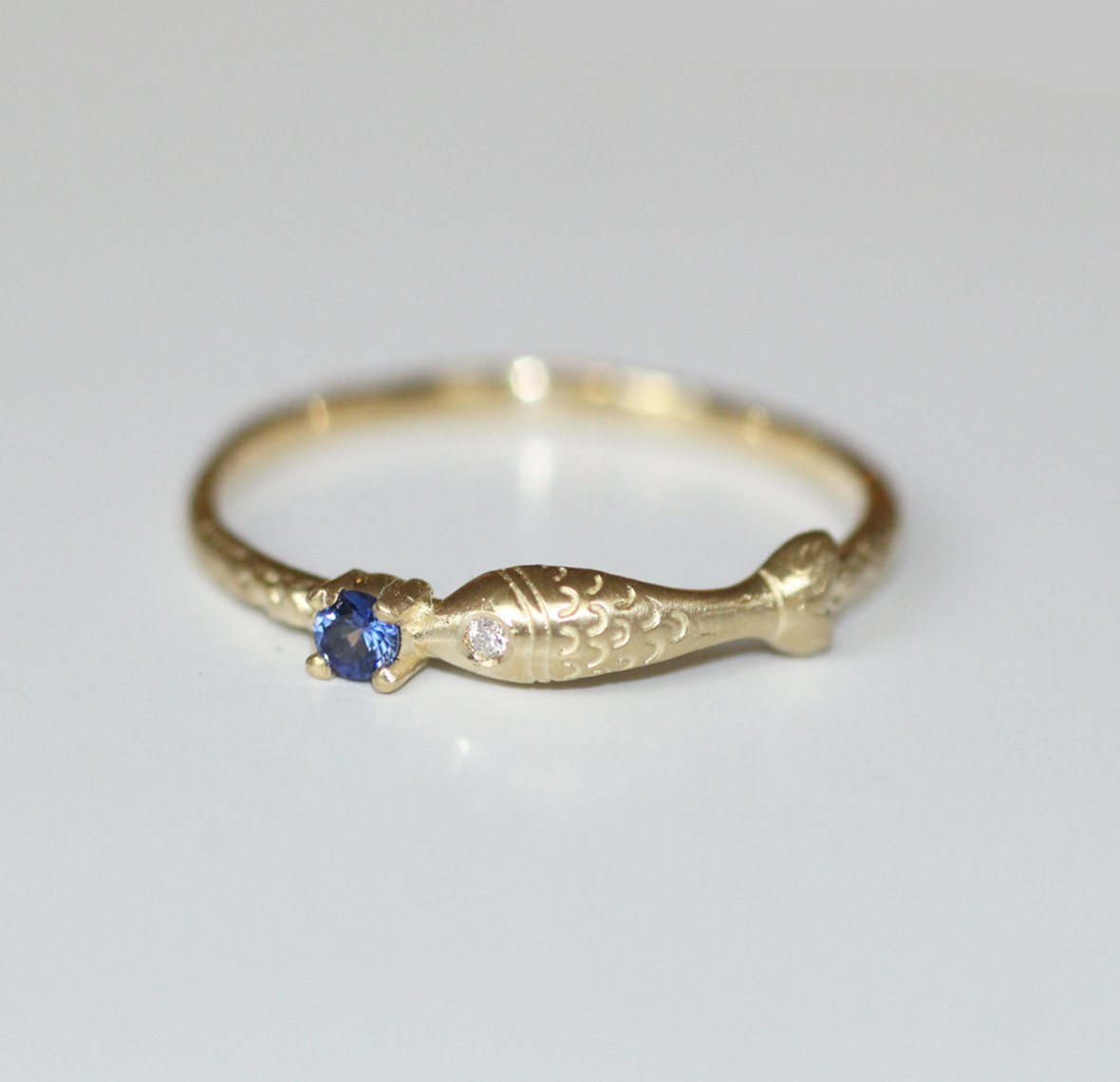 Dainty koi ring, a lucky charm for your finger. With a sparkling diamond eye and a blue sapphire, this delicate piece is as playful as the fish it represents. Perfect for a pinky promise or any finger, it's a whimsical talisman of protection and fortune.
