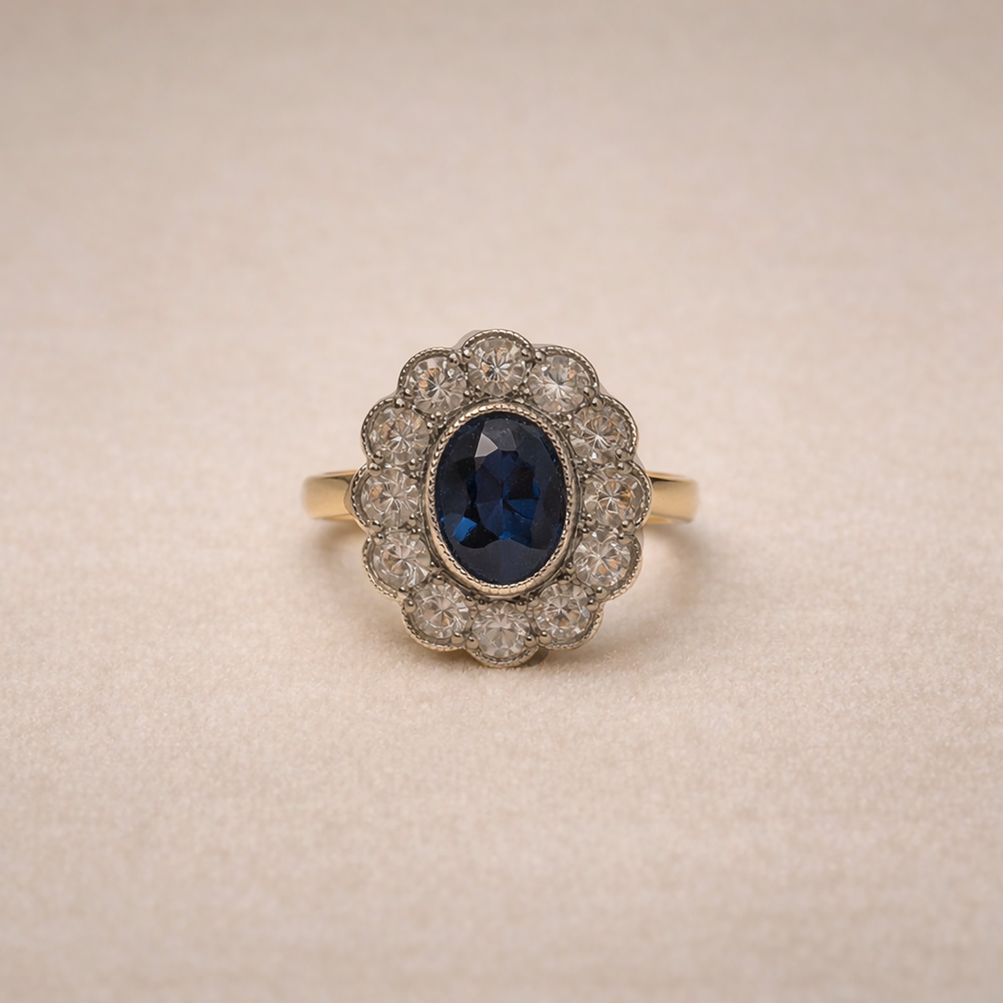 A timeless heirloom, this ring features a deep midnight-blue sapphire embraced by scalloped antique gold lace and crowned with a delicate halo. Champagne diamonds glow softly, weaving a story of enduring love and quiet elegance—equally perfect as a daily treasure or a bold statement piece.