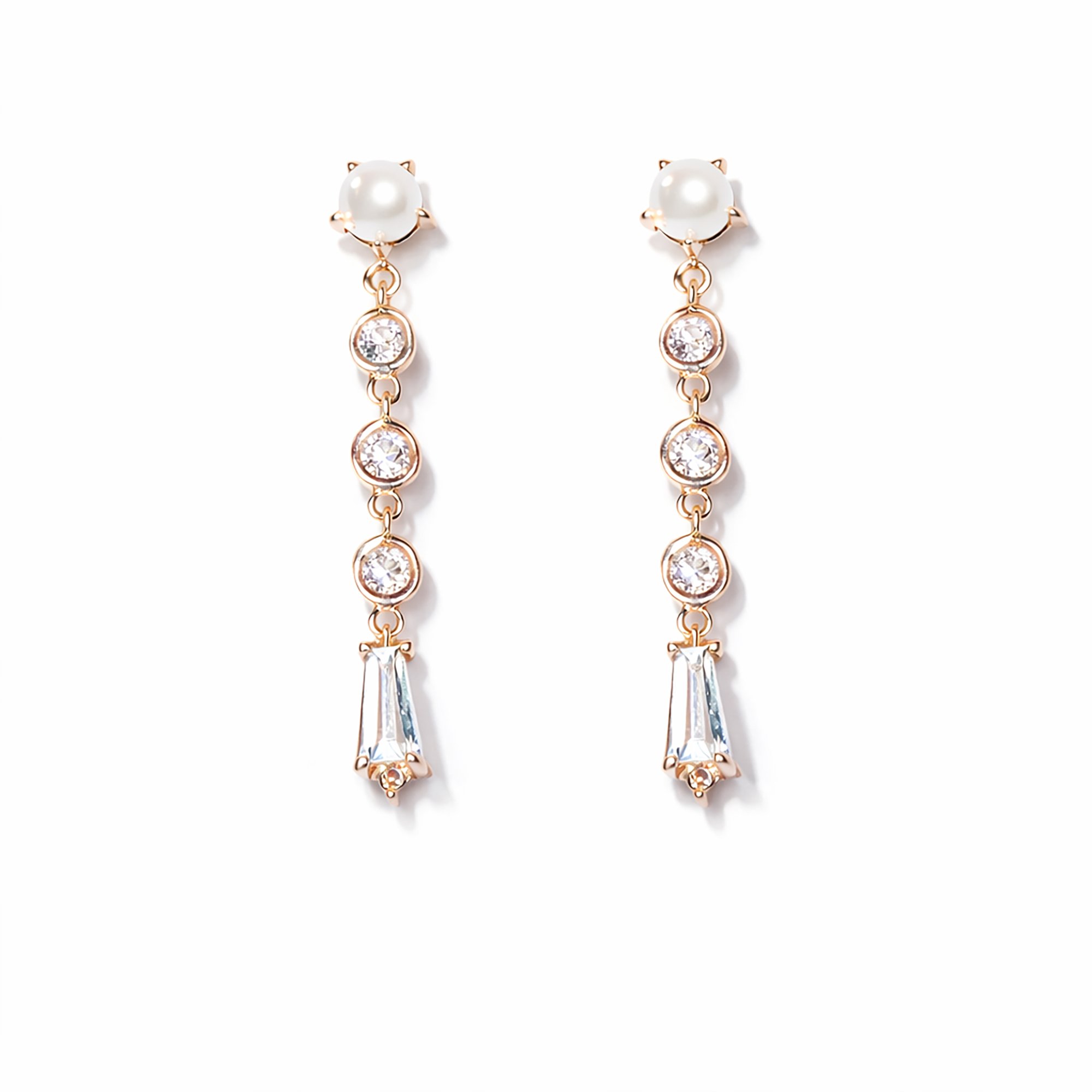 Softly luminous pearls, delicate round champagne diamonds, and a refined baguette-cut white sapphire fall in harmony—creating a poised silhouette that moves with understated luxury.