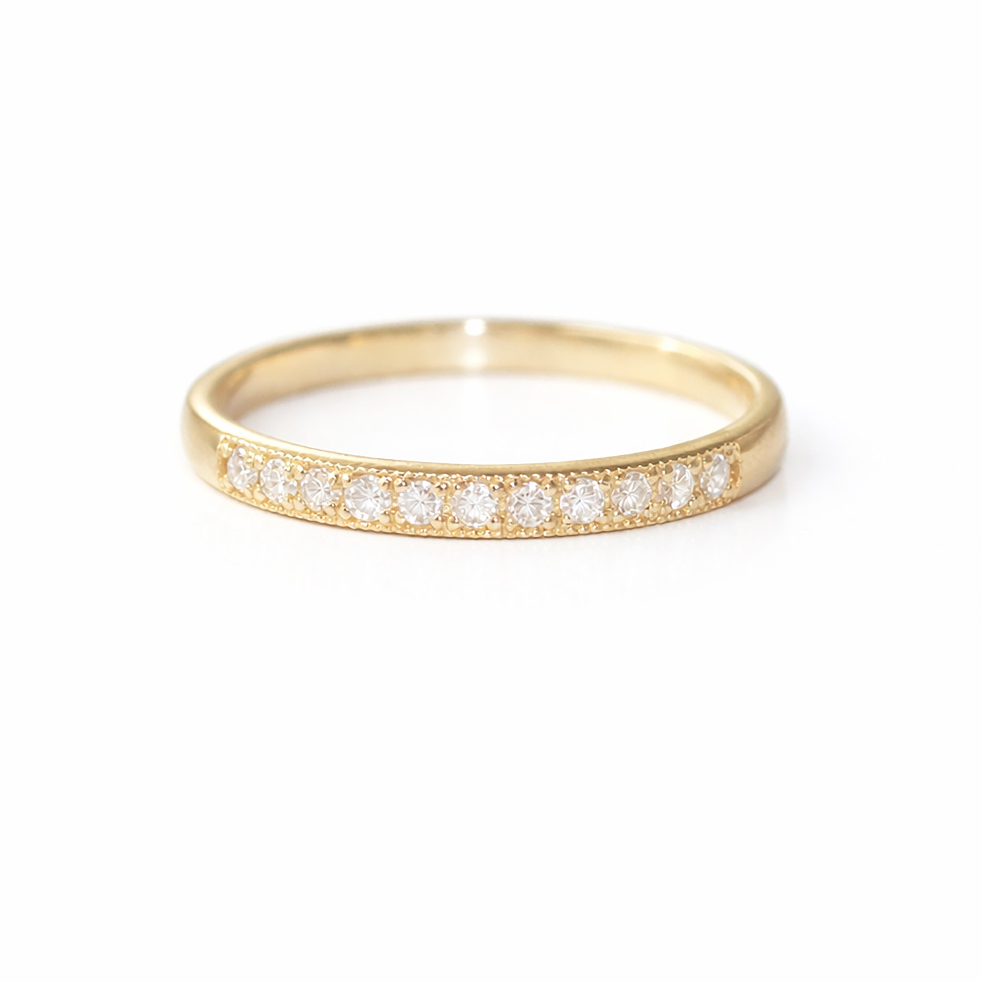 Whispers of the past meet modern grace — a detailed milgrain texture frames a white diamond, creating timeless beauty with subtle brilliance. A perfect complement to your ring stack, yet luminous enough to wear on its own.