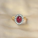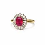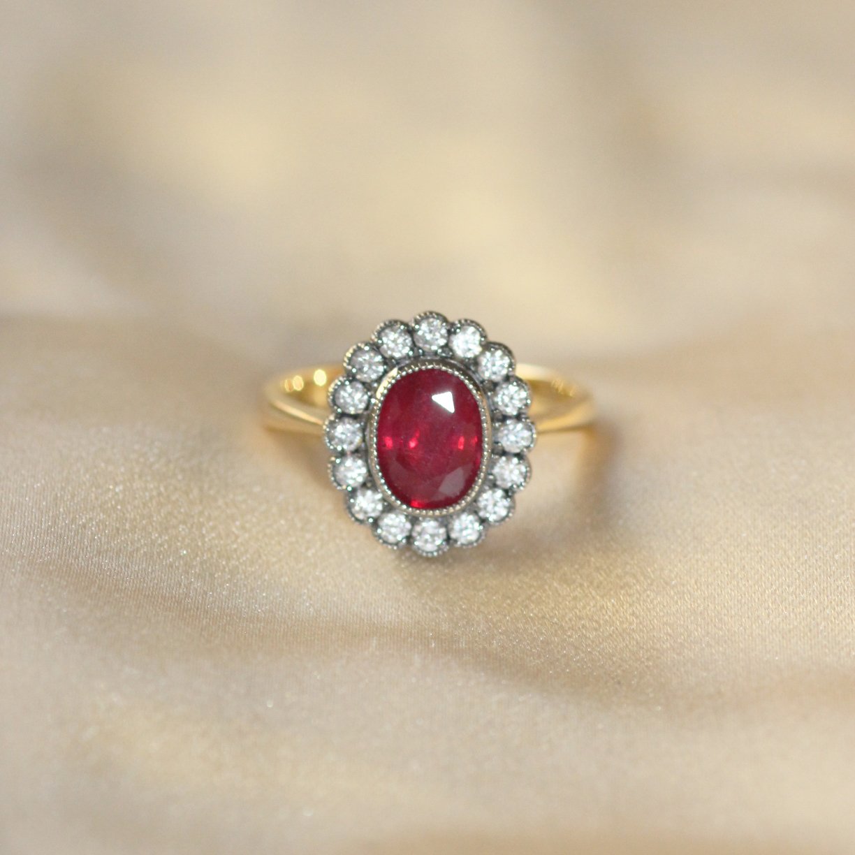 A radiant natural ruby takes center stage, surrounded by sparkling white diamonds, all set in beautifully antiqued gold. Inspired by Princess Diana’s timeless elegance, this ring blends classic beauty with vintage charm—whispering grace and sophistication with every glance.