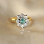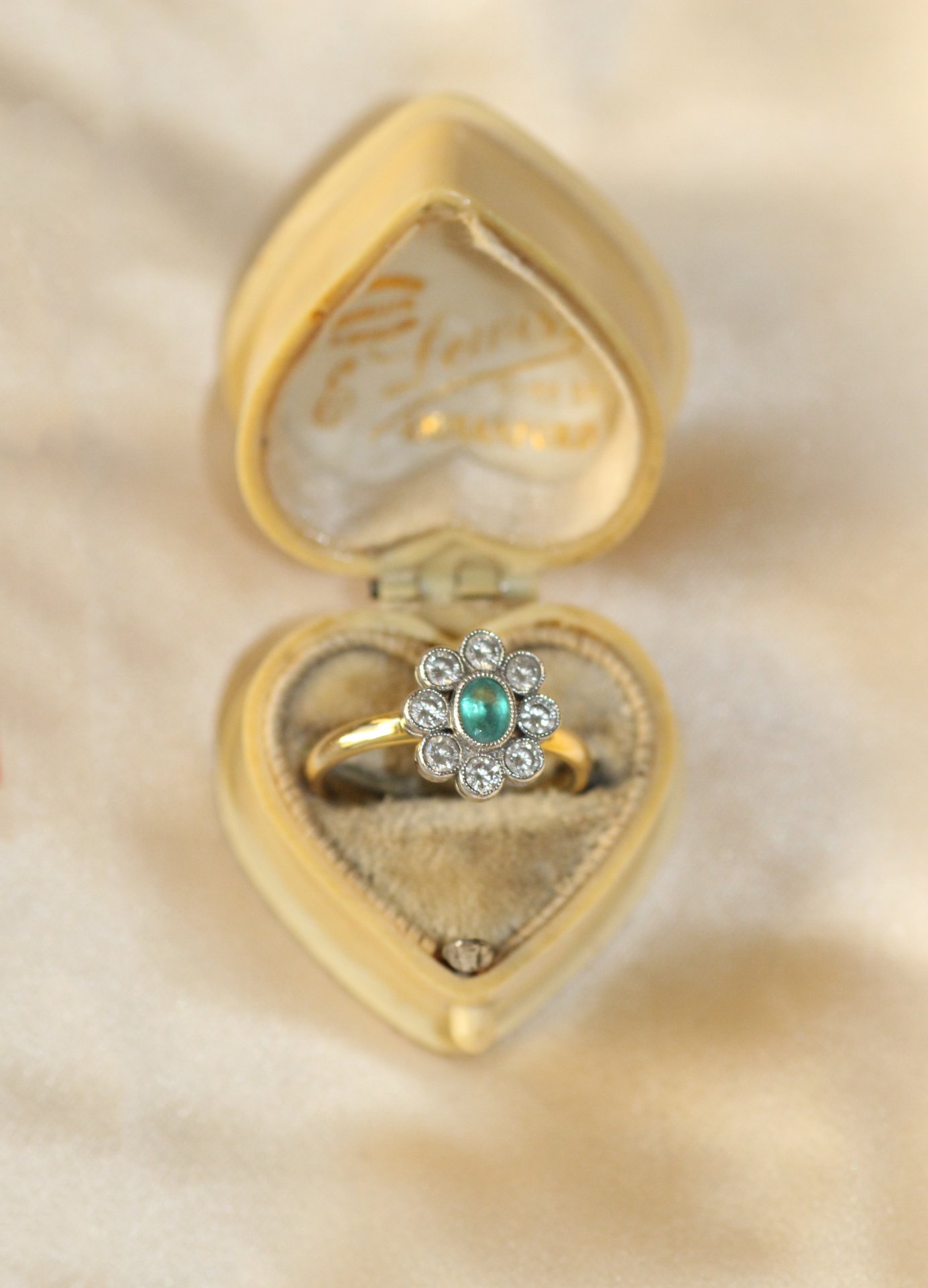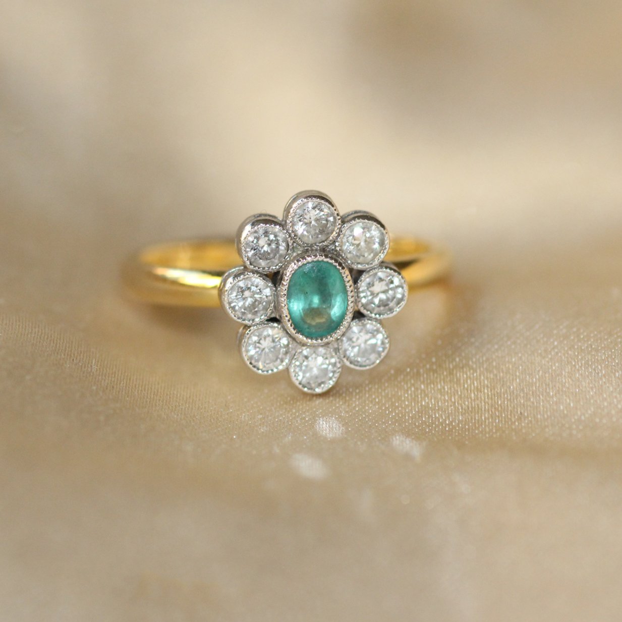 Where nature’s vibrant emerald meets a halo of shimmering lab-grown diamonds—pure vintage romance.