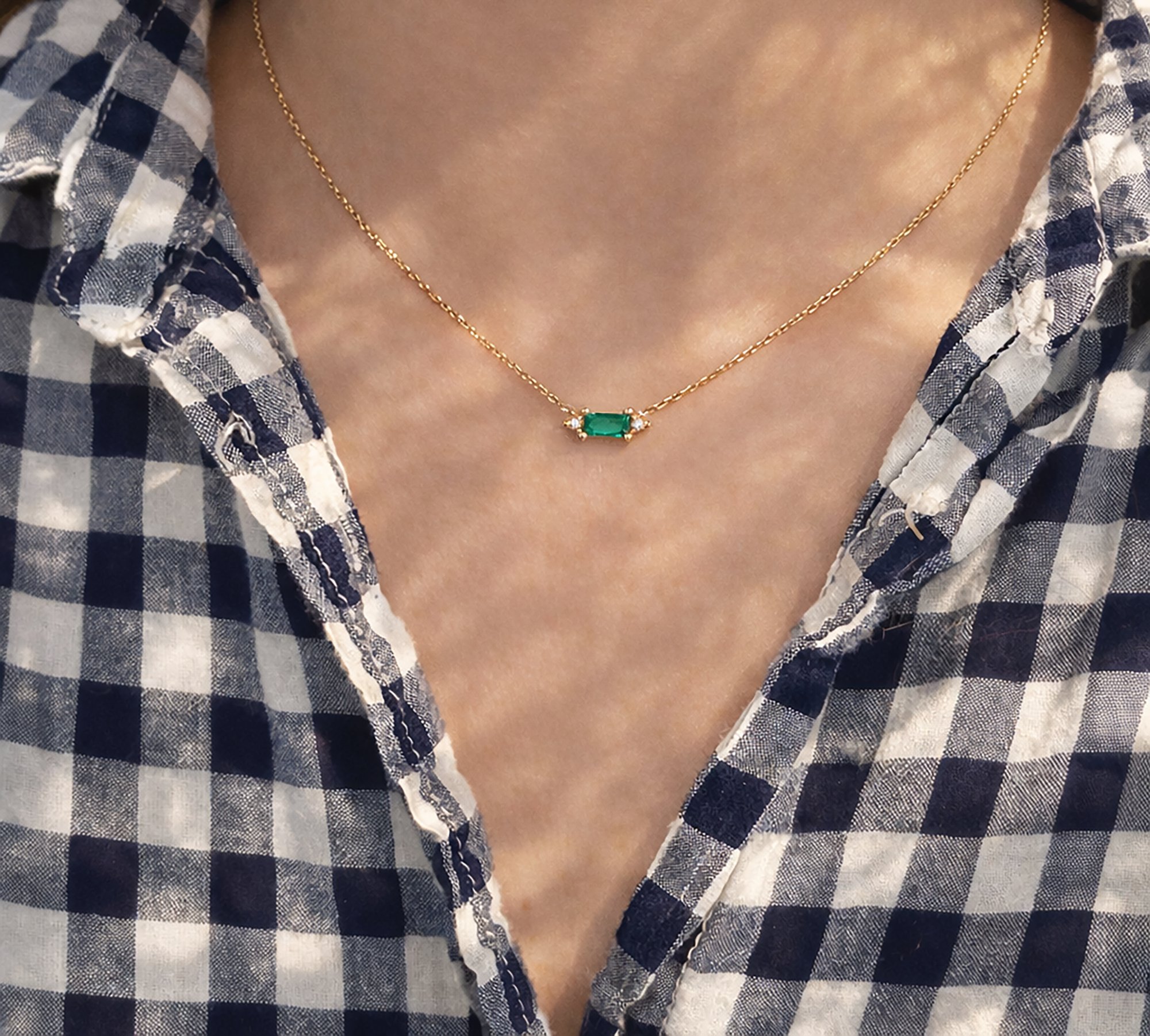 Emerald baguette stone with tiny champagne diamonds on a sparkly delicate chain.