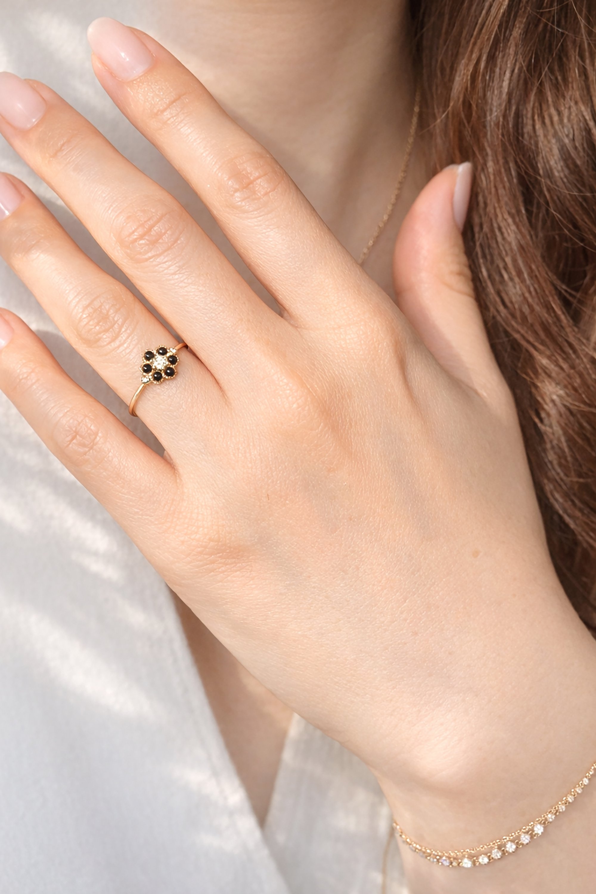 A rich black onyx unfolds into a daisy in full bloom—elegant, dainty, and timeless. At its heart, a champagne diamond sparkles softly, catching light with every turn. A dainty yet striking statement piece, perfect for any occasion.