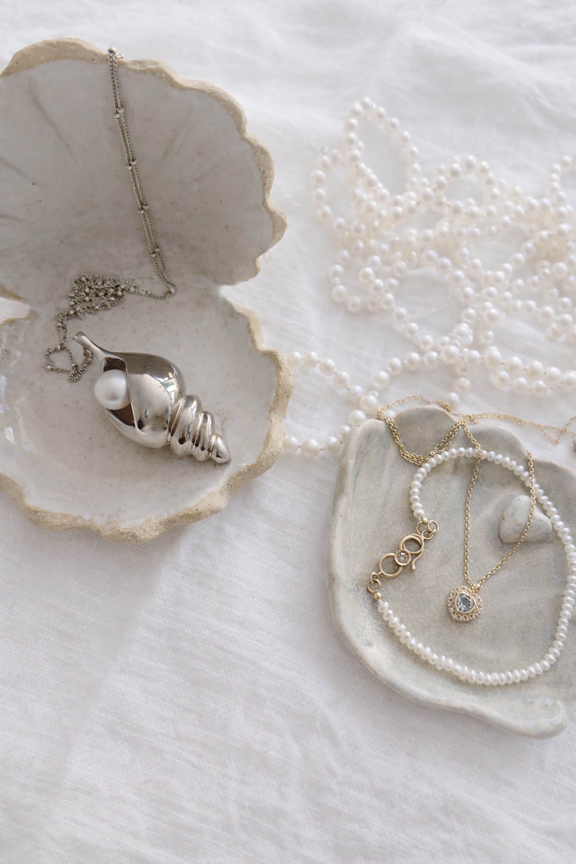 Inspired by the quiet beauty of the sea, the gently open shell cradles rings, earrings, and delicate chains—like a pearl kept safely within its shell.