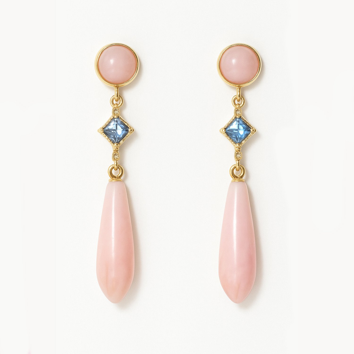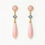 These delicate drop earrings feature a soft pink opal teardrop with a gentle glow. They’re accented by a sparkling blue sapphire and topped with a smooth pink opal cabochon for a beautiful mix of colors and shapes.