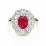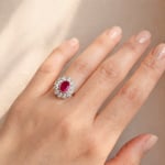 This exquisite ruby halo ring is a masterpiece of timeless design, inspired by antique jewelry. A captivating ruby, the heart of this ring, is encircled by a delicate scallop-shaped halo of sparkling white diamonds. Each diamond, meticulously set, adds a touch of brilliance to the already stunning centerpiece.