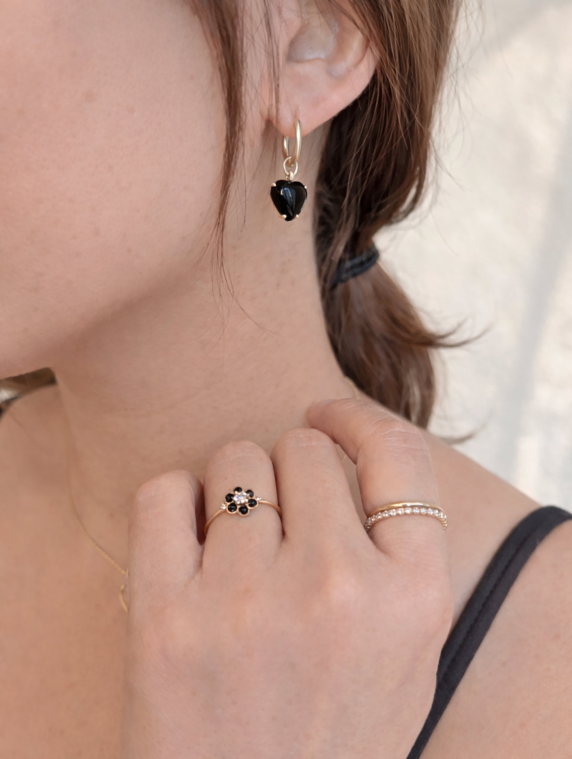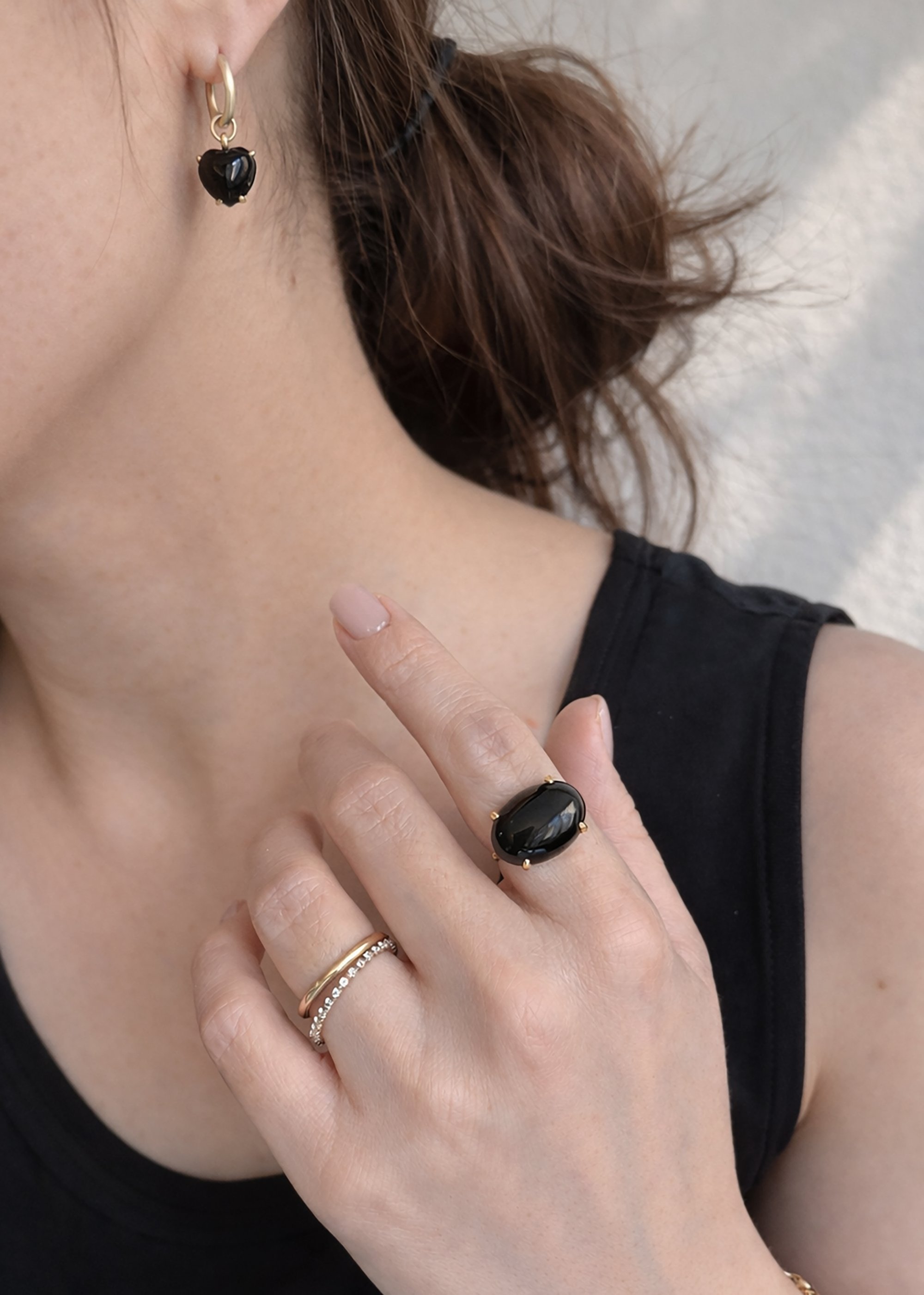 pair a calm matte gold circle with a black onyx heart, suspended just below the ear. The deep, inky tone brings a sense of quiet strength and clarity, balanced by a smooth, rounded silhouette and delicate prong setting.