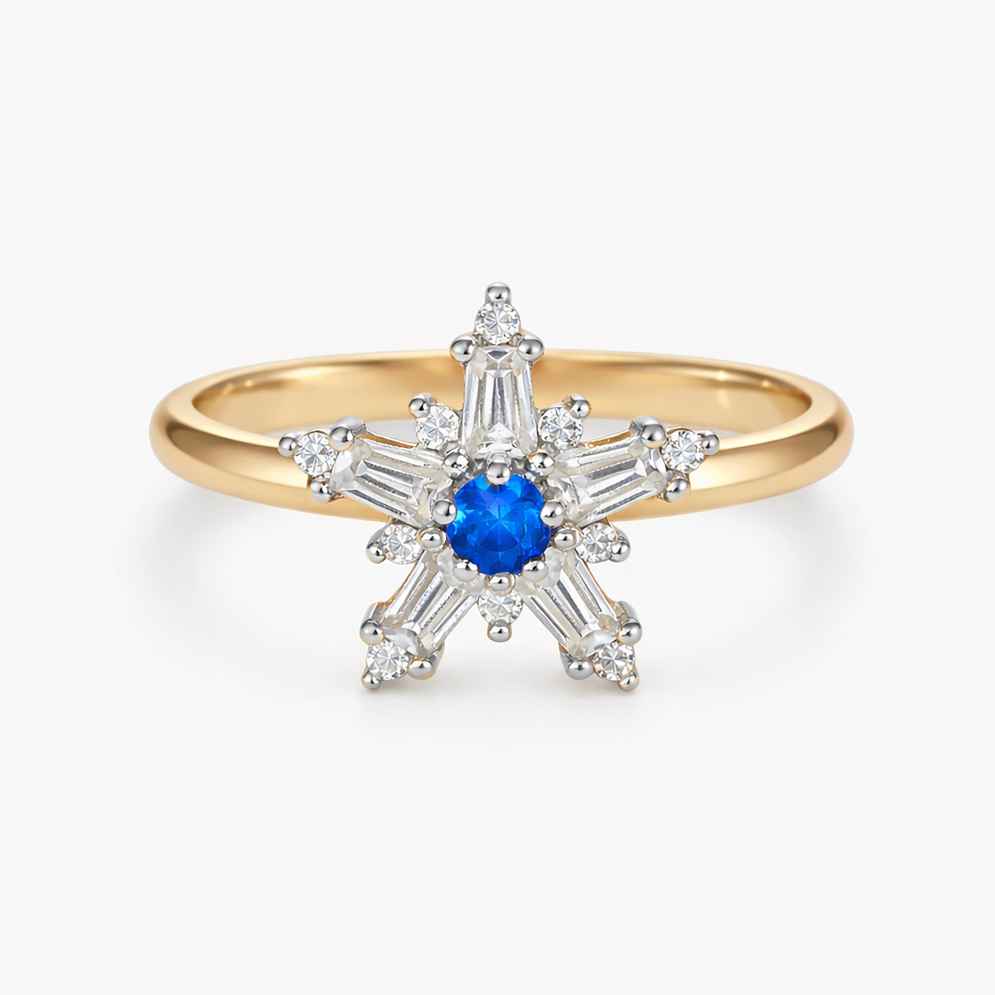 A deep blue sapphire cradled like a precious secret, surrounded by white sapphire baguettes and twinkling diamonds in a stunning star-shaped, Deco-inspired design. This unique ring blends vintage glamour with modern elegance, making it a standout piece that adds timeless beauty and starry allure to any look.