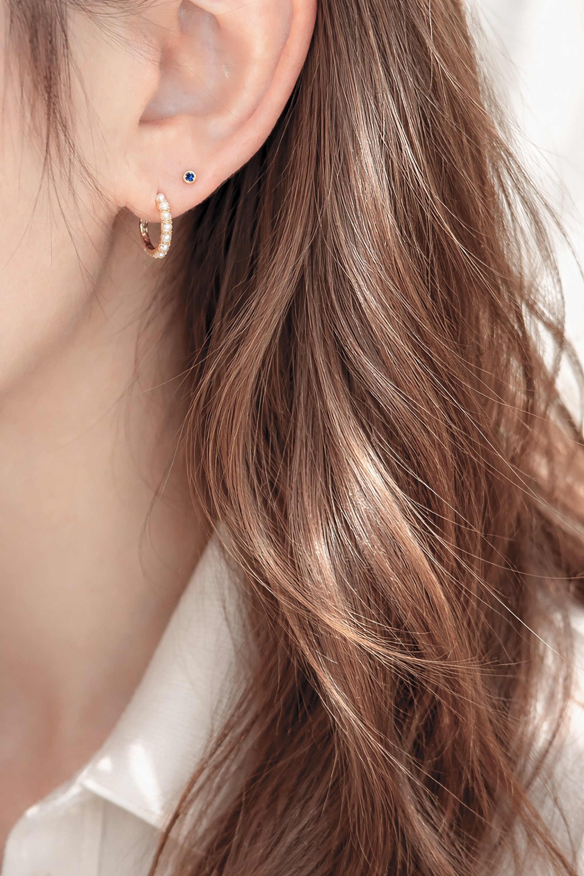 The deep blue stone sits close to the ear in a smooth bezel setting,