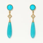 A Sleeping Beauty turquoise teardrop, long and luminous, sways beneath a glinting square-cut white sapphire, kissed by light. At the top, a serene turquoise cabochon completes the story—a delicate cascade of color, grace, and calm.