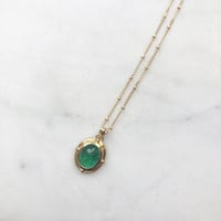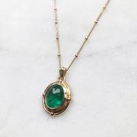 A striking one-of-a-kind oval emerald cabochon rests within a smooth frame, suspended from a delicate beaded chain. This bold pendant captures the timeless elegance of Victorian design, making a statement with its rich color and refined simplicity.