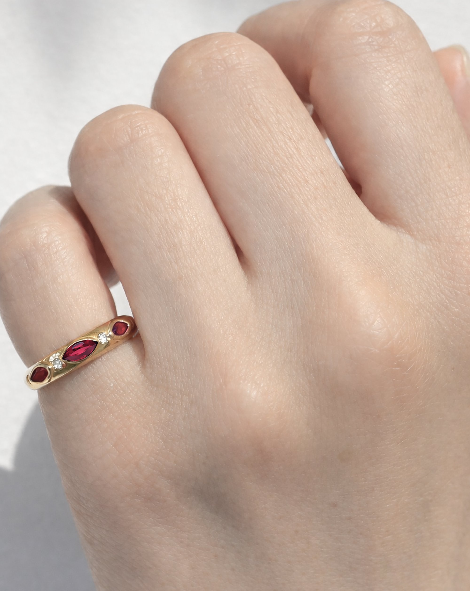 Softly aglow with marquise ruby cabochons and champagne diamonds, this ring captures the warmth of everlasting love — a timeless piece where passion meets grace.