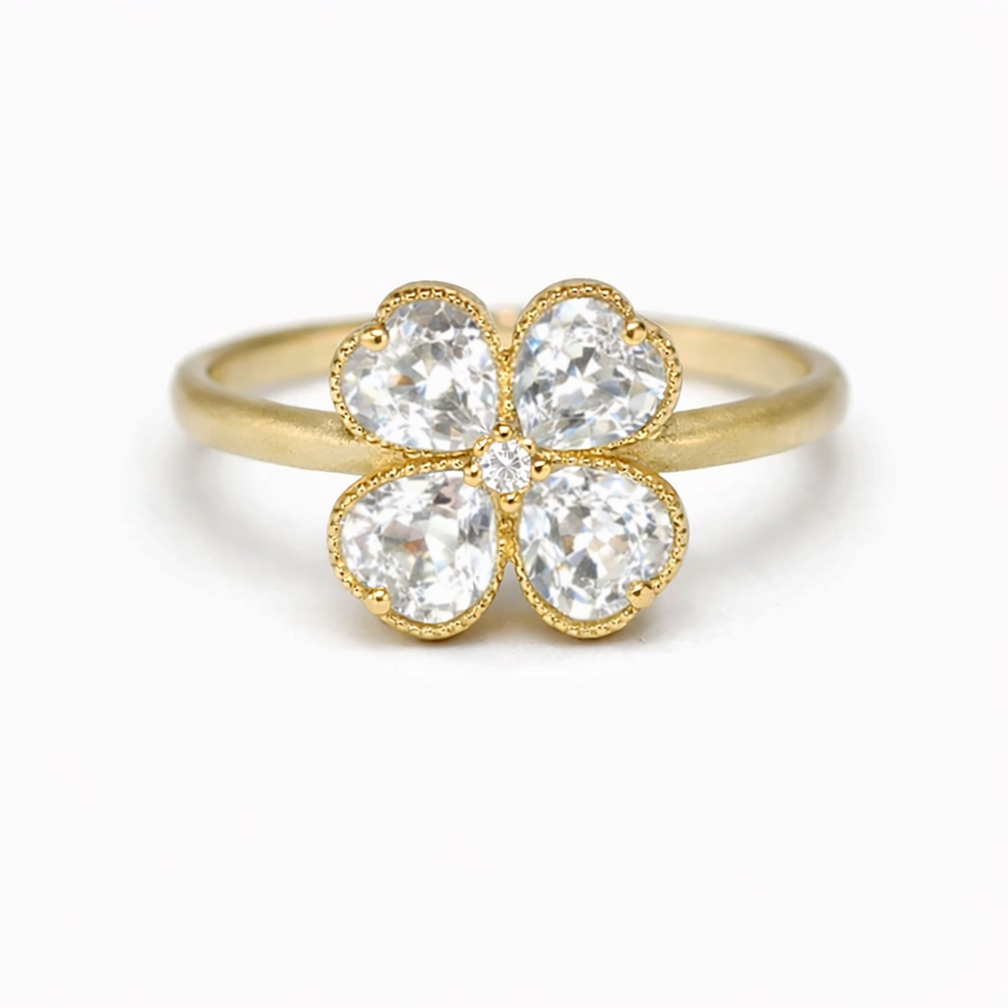 A delicate clover crafted from four heart-shaped white sapphires, whispering wishes of luck and love. An elegant reminder that magic is always close at hand.