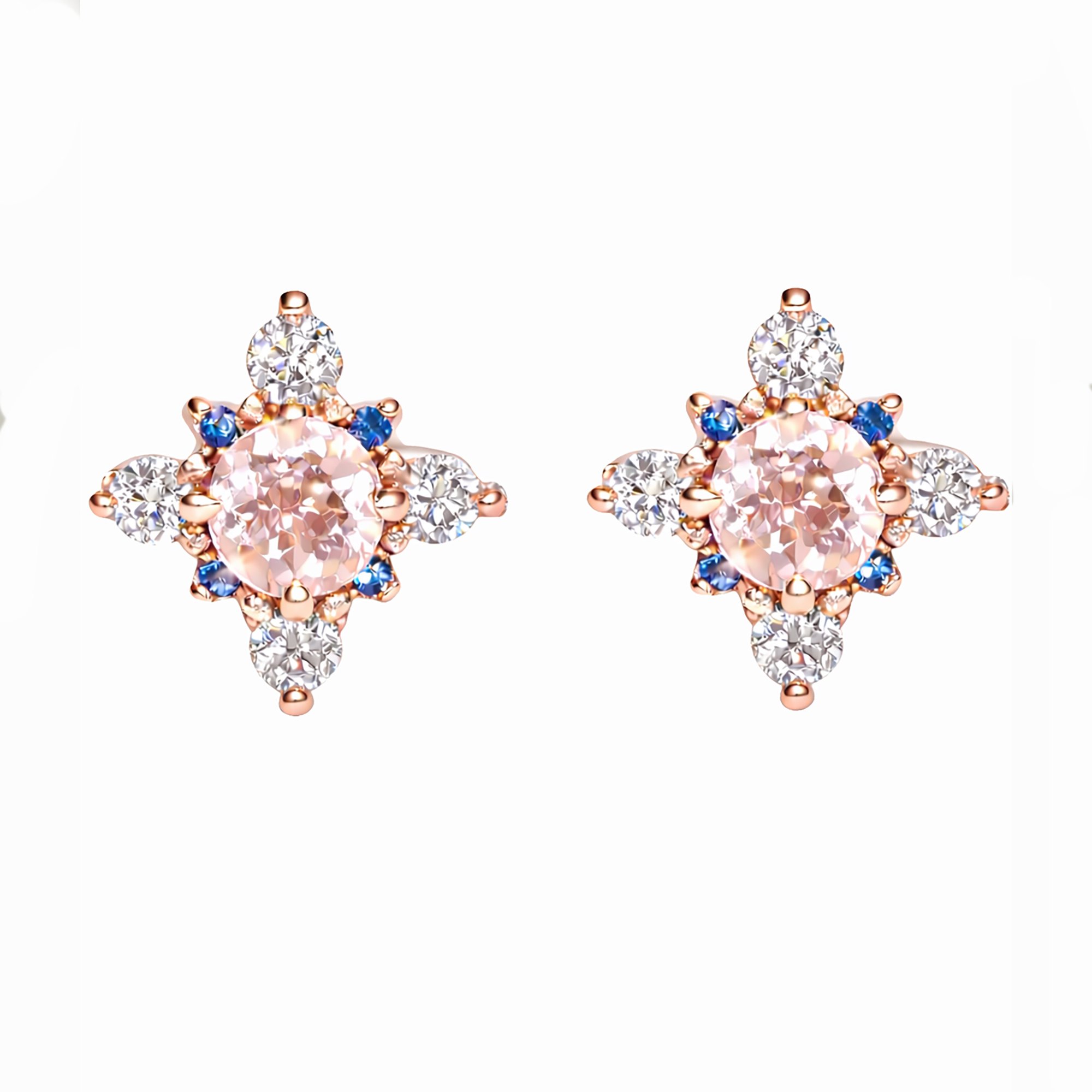 A soft blush morganite sits at the center, framed by crisp diamonds and deep blue sapphires that catch the light like winter stars.